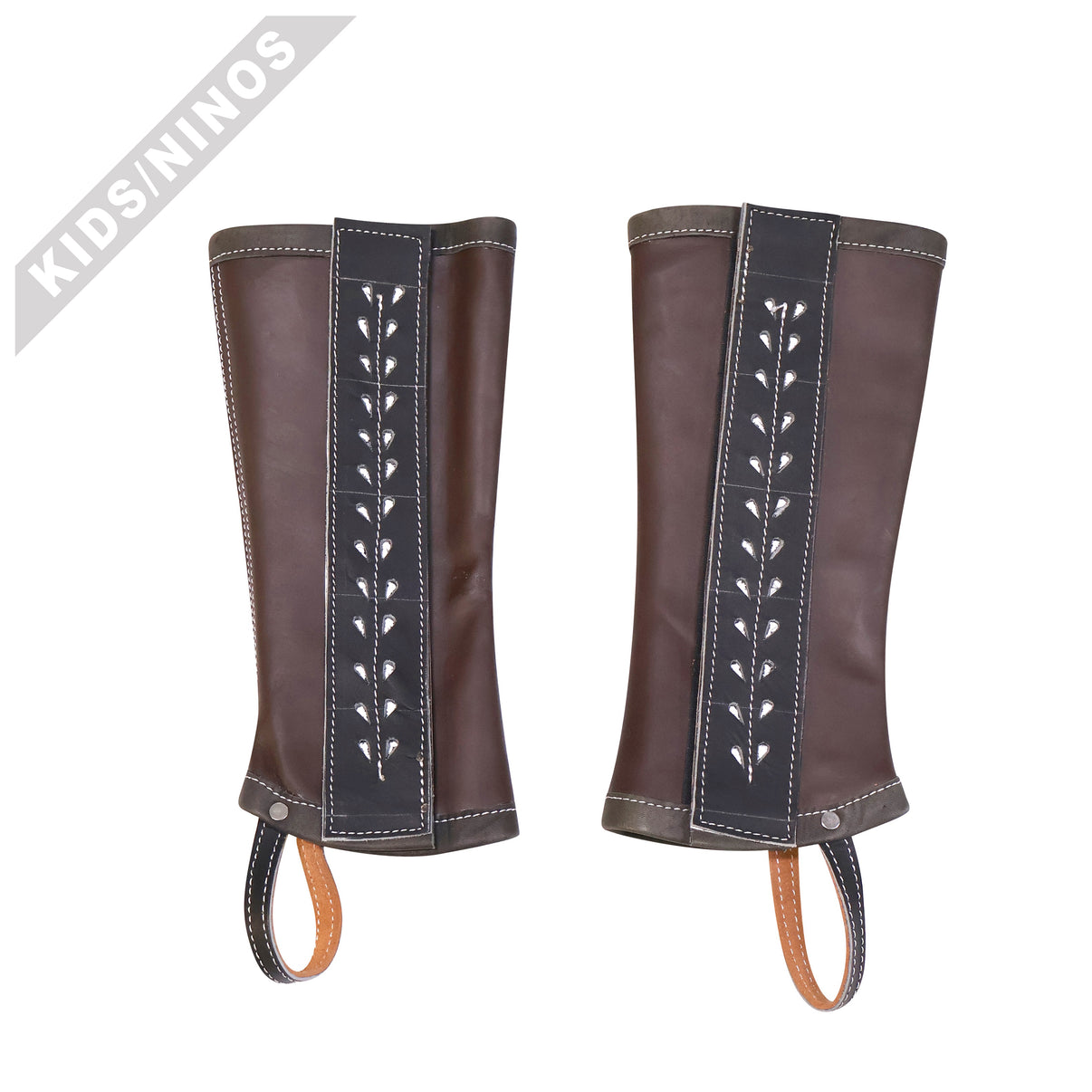 Polainas charras para niño/niña fabricadas en piel y resistente. Cierre de velcro completo para un ajuste seguro. Fáciles de poner y ajustar.